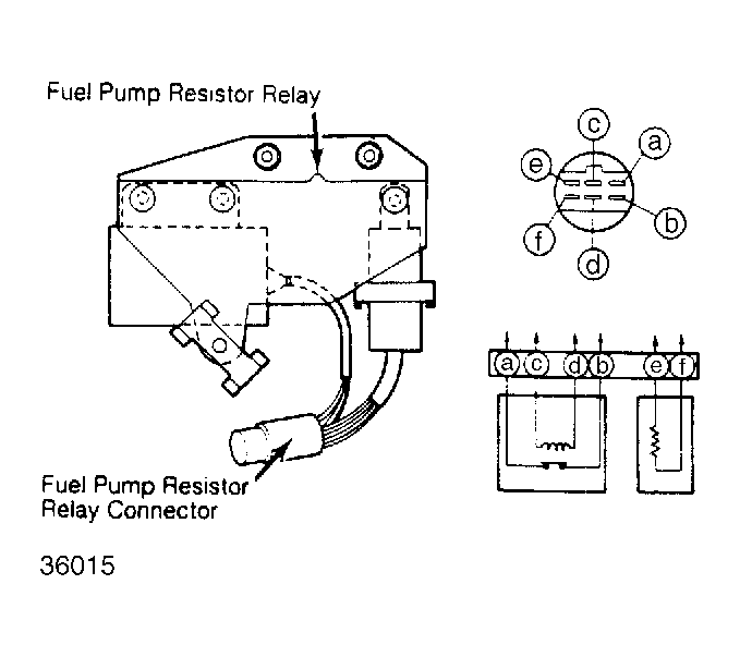 2. Measure resistance between the following terminals. Resistance between terminals "c" and "d" should be 60-92 ohms and between "e" and "f" should be .70-.94 ohms. If resistor relay does not test as specified, replace relay.