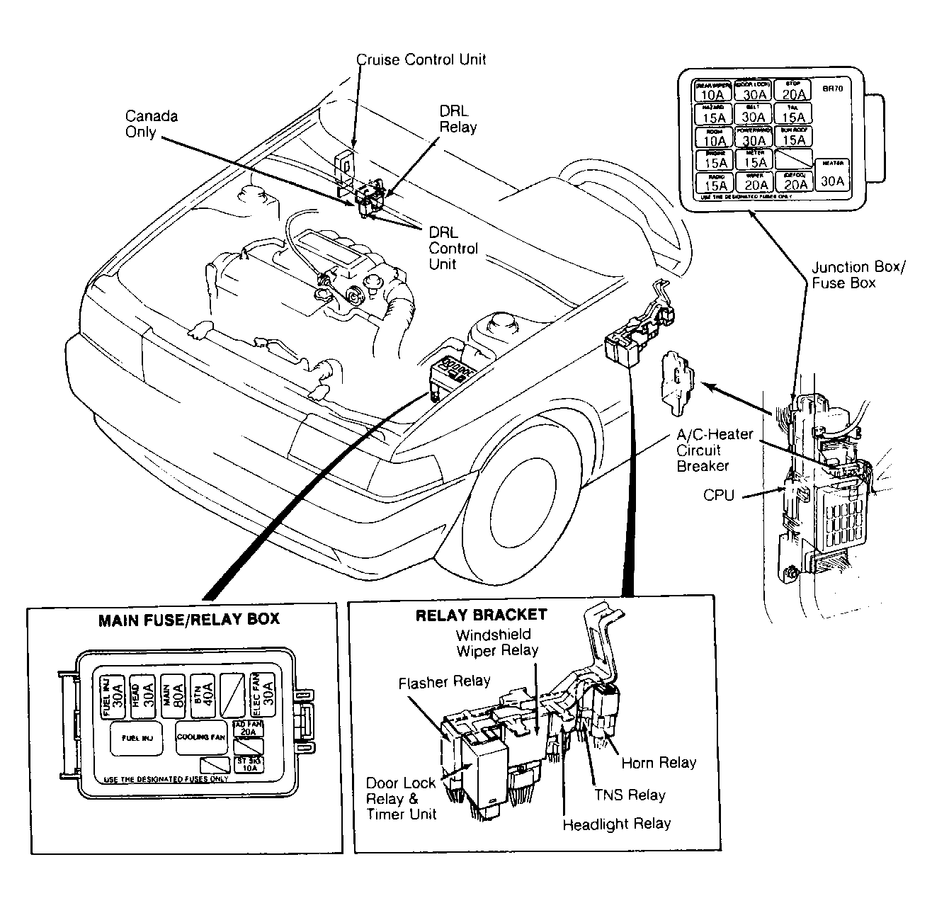 Daytime Running Light (DRL) Control Unit (Canada) Below cruise control unit on right kick panel. See Figure & Figure .