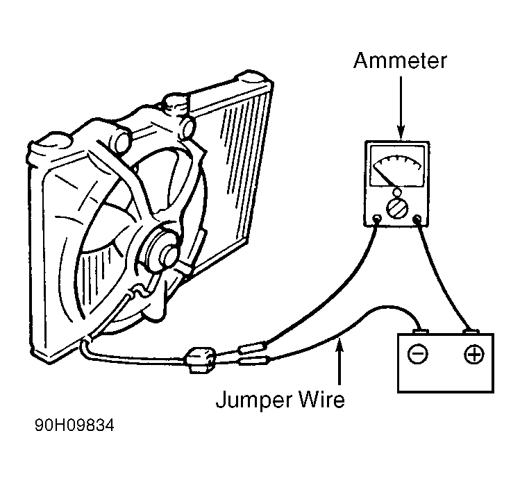 - Ensure battery is fully charged. Disconnect fan motor connector. Connect ammeter between battery and cooling fan motor connector. See Fig 1 .
