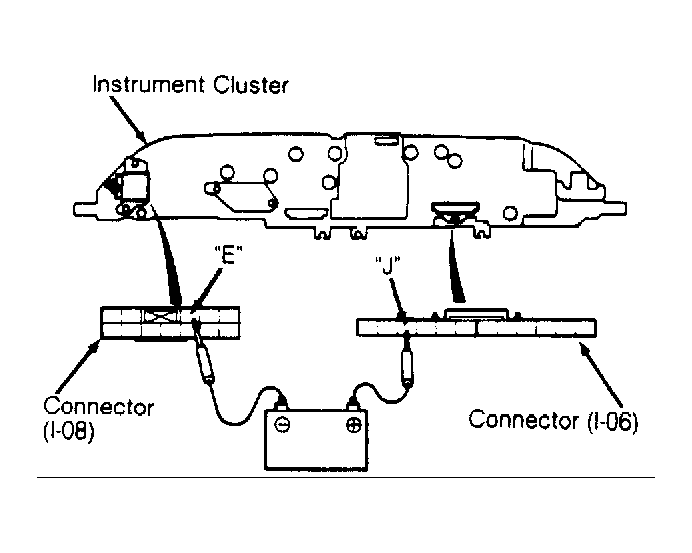 - Start engine, and observe ANTI-LOCK light. Light should illuminate for a few seconds. If light does not illuminate as described, remove instrument cluster. Connect 12 volts to terminal "J" of instrument cluster connector I-06. See Fig 3 . Using a jumper wire, connect terminal "E" of instrument cluster connector I-08 to negative ground. ANTI-LOCK light should illuminate. If light does not illuminate, check bulb. If bulb is okay, check meter fuse and wiring harness.