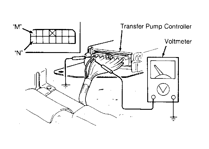 2. Turn ignition on. Ground fuel pump control unit terminal "M" with jumper wire. Verify that zero volts is present at control unit terminal "N". Remove the jumper wire and check that voltage is 12 volts in about 10 seconds. If not, disconnect transfer pump connector. Turn ignition on. Verify that the voltage is 12 volts at terminal "N" of the transfer pump connector. If not, replace transfer pump control unit.