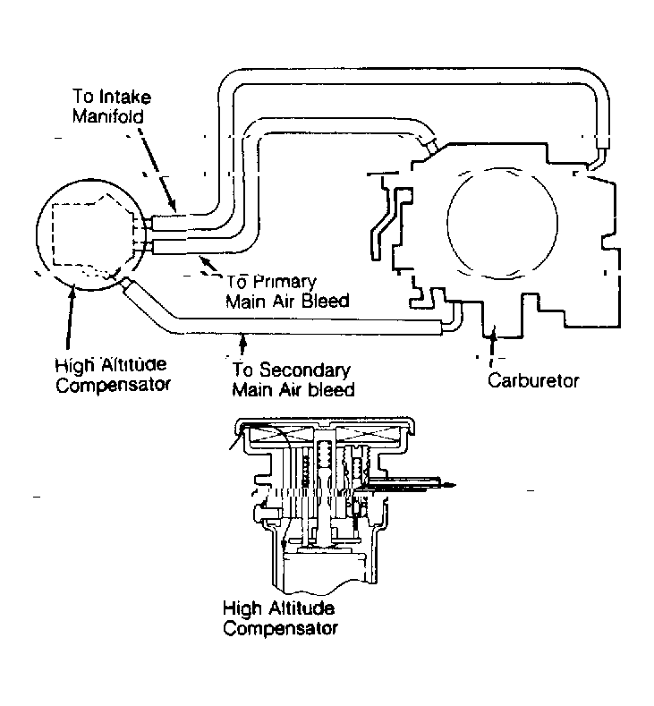 Disconnect high altitude compensation system air hoses from carburetor. See Fig 1 . Check high altitude compensator by blowing through each disconnected air hose. At altitude of higher than 1640 feet, air should pass through each hose. At lower altitude, no air should pass through hoses.