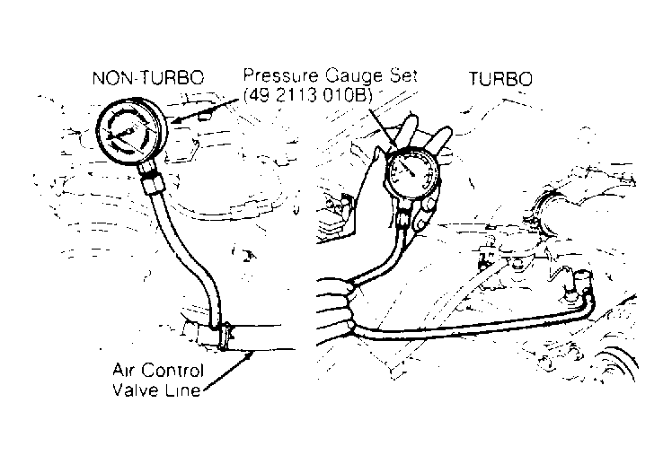 - Stop engine. Disconnect line from air pump to air control valve at the valve. Install Pressure Gauge Set (49 2113 010B) to the line. See Fig 1 . Connect tachometer to engine.