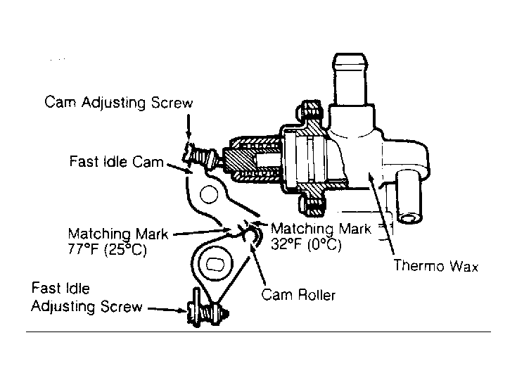 - Engine and throttle body must be at temperature of 77°F (25°C) prior to checking. Check that matching mark on fast idle cam is aligned with center of cam roller. See Fig 1
