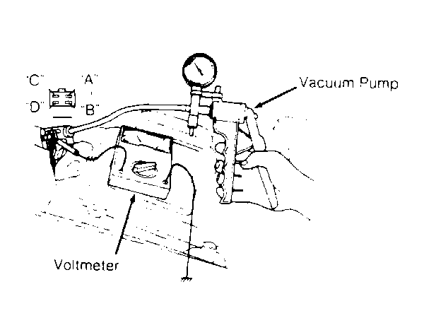 1. Disconnect vacuum hose from sensor. Connect voltmeter to "D" terminal. See Fig 1 . Using vacuum pump, apply 3.9 in. Hg to sensor.