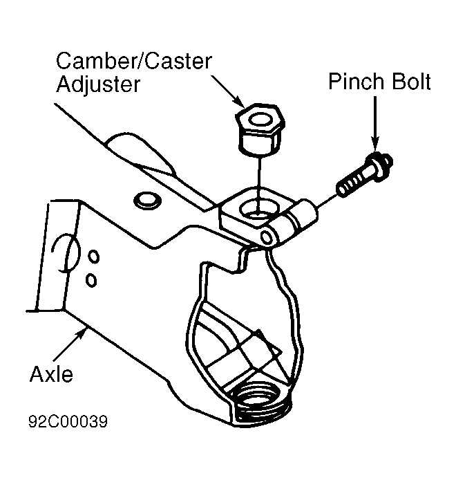 2. Remove pinch bolt and camber/caster adjuster from axle. See Figure. Install appropriate camber/caster adjuster and rotate to desired adjustment. See Figure. Install NEW adjuster snap ring. Install caliper, steering knuckle and wheel assembly. Check alignment to verify correct adjustment.