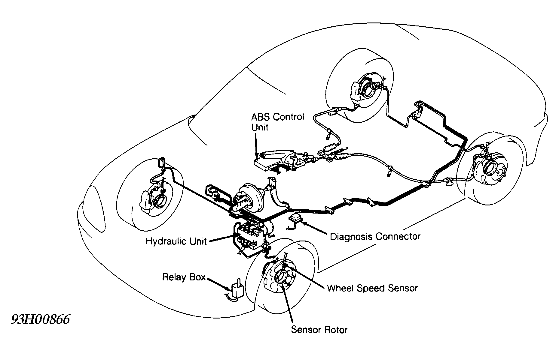 The Anti-Lock Brake System (ABS) control unit senses reductions in front and rear wheel speed and modulates hydraulic pressure to the brakes to prevent wheel lock-up. The ABS consists of hydraulic unit, relay box, 4 speed sensors and sensor rotors, diagnosis connector, and ABS control unit. See Fig 1 . An ABS warning light is located on the instrument panel.