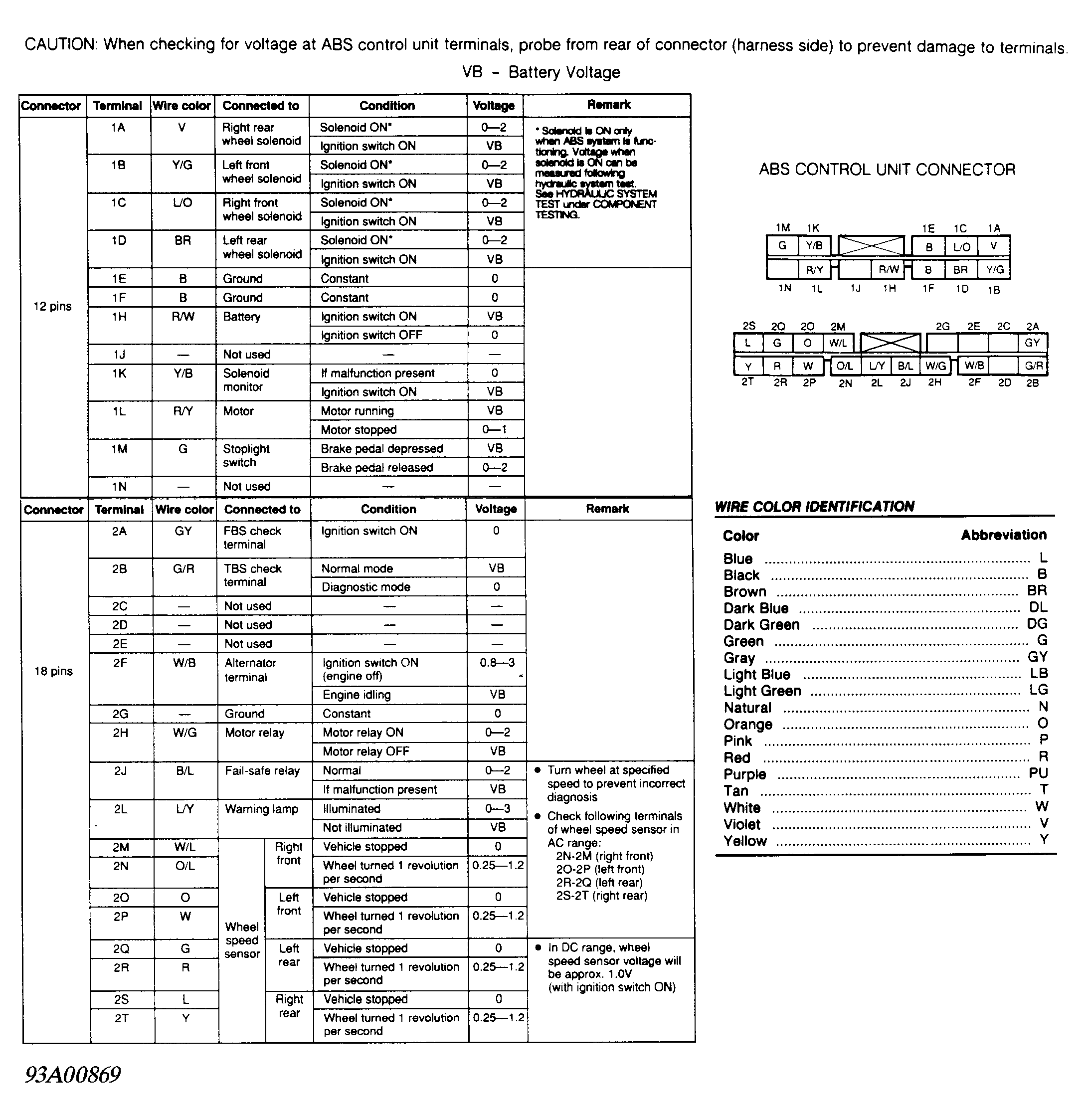 When checking for voltage at ABS control unit terminals, probe from rear of connector (harness side) to prevent damage to terminals. See Fig 1 .