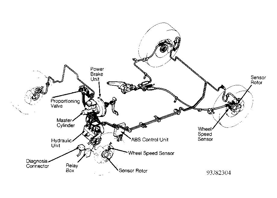 The Anti-Lock Brake System (ABS) control unit senses reductions in front and rear wheel speed and modulates hydraulic pressure to the brakes to prevent wheel lock-up. ABS consists of hydraulic unit, relay box, 4 speed sensors and sensor rotors, diagnosis connector, and ABS control unit. See Fig 1 . An ABS warning light is located on instrument panel.