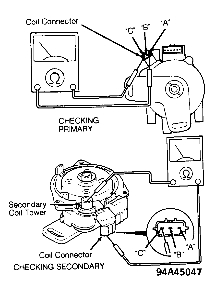 1. Remove primary and secondary leads from ignition coil. Using ohmmeter, check primary resistance between terminals "A" and "B" of coil. See Fig 1 . Resistance should be as specified in IGNITION COIL RESISTANCE table. If resistance is not as specified, replace ignition coil.