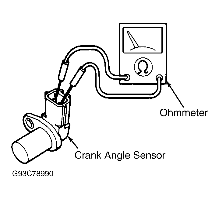 1. Disconnect crank angle sensor connector. Crank angle sensor is a separate unit located at front of crankshaft. Measure resistance between terminals. See Fig 1 . If resistance is not as indicated, replace crank angle sensor.