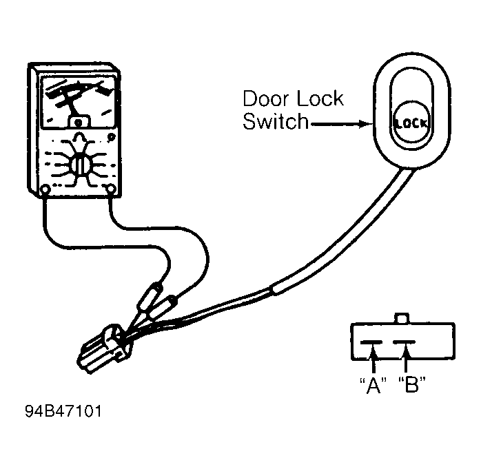 - Remove door trim panel. Disconnect door lock switch 3-pin connector. Check continuity between terminals "A" and "B" of door lock switch connector. SeeFig 1