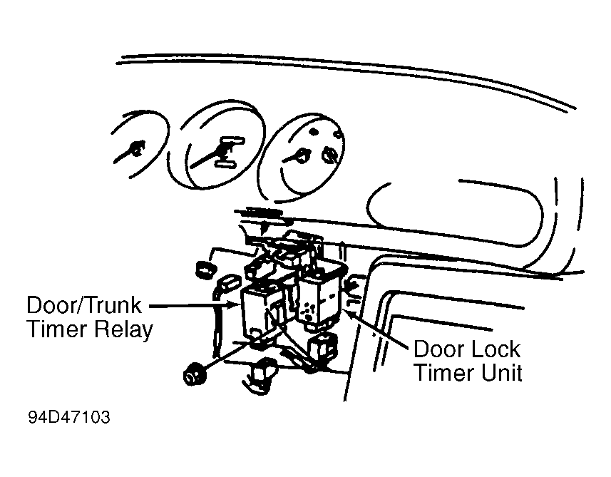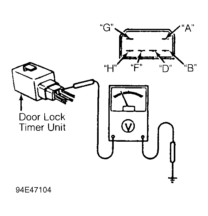 Remove door lock timer unit from bracket. SeeFigure . DO NOT disconnect door lock timer unit connector. A list of door lock timer unit connector terminals with specified voltages follows. Measure voltage at each door lock timer unit connector terminal (backprobe connector). SeeFigure . If voltages are not as specified, check wiring. If wiring is okay, replace door lock timer unit.