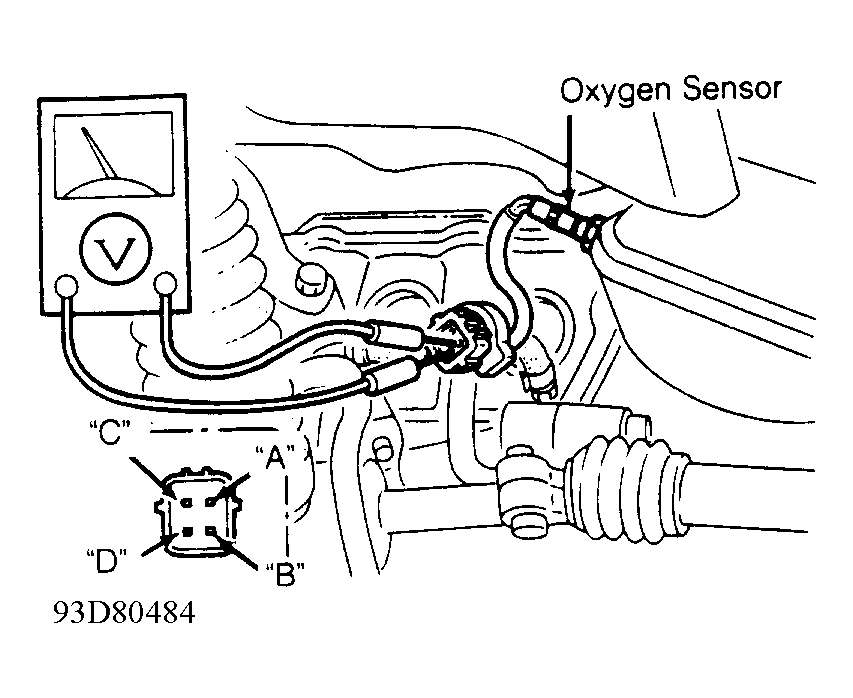 - Warm engine to operating temperature. Operate engine at idle. Disconnect O2S sensor electrical connector. Connect voltmeter between O2S sensor connector terminals "A" and "B". See Fig 1 .