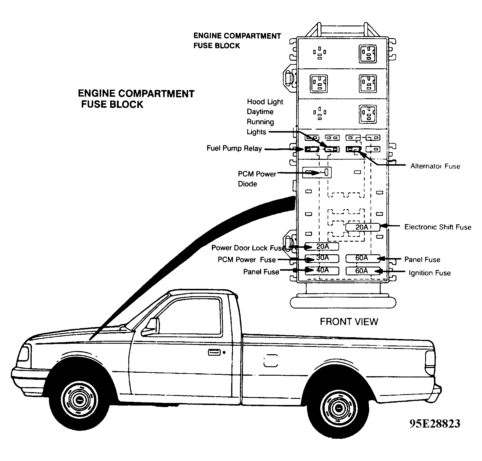 | Engine Compartment Fuse Block (Panel Identification) | On right front corner of engine compartment, behind battery. See Figure . |