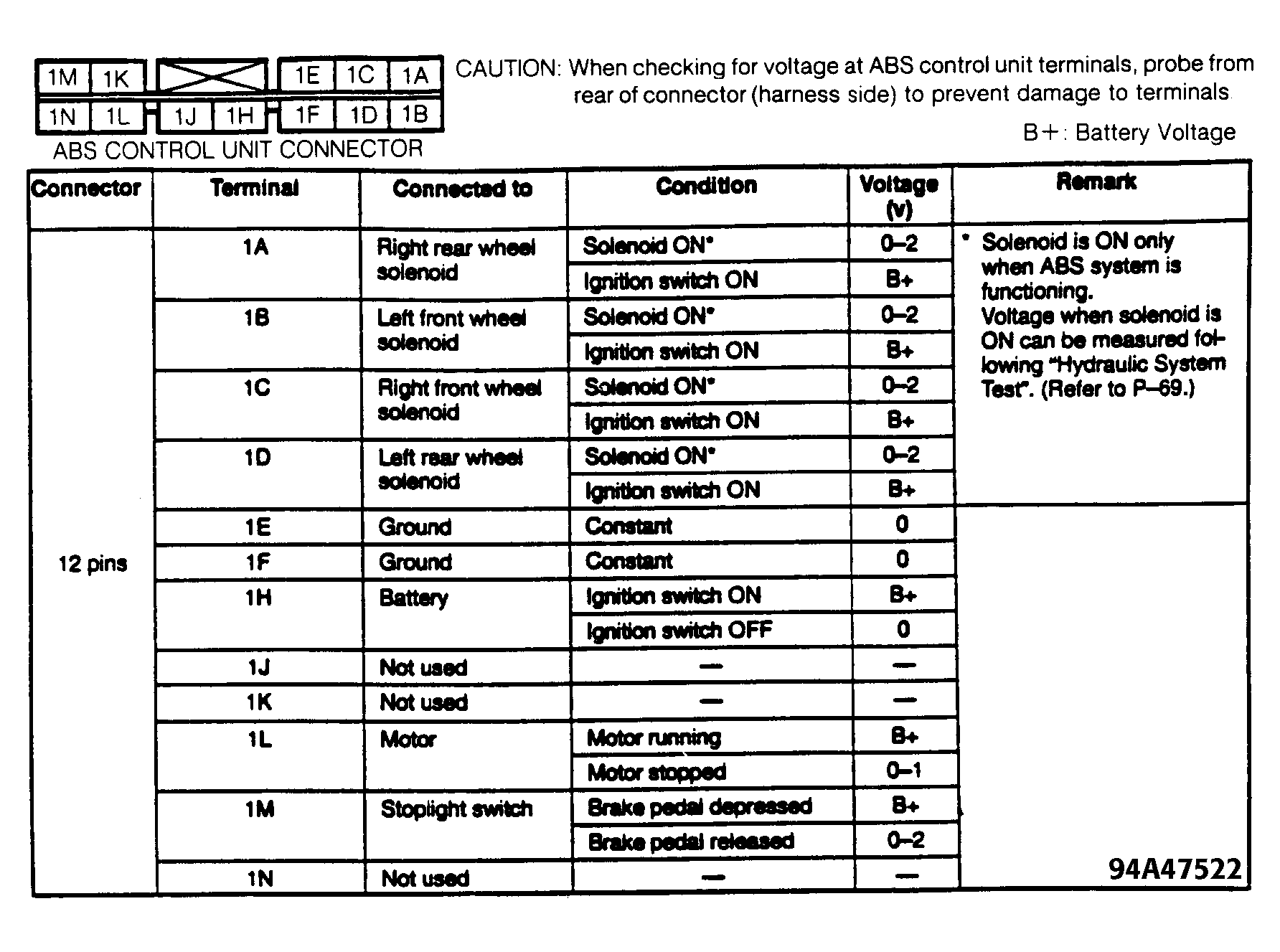 When checking for voltage at ABS control unit terminals, probe from rear of connector (harness side) to prevent damage to terminals. See Fig 1 and Figure .