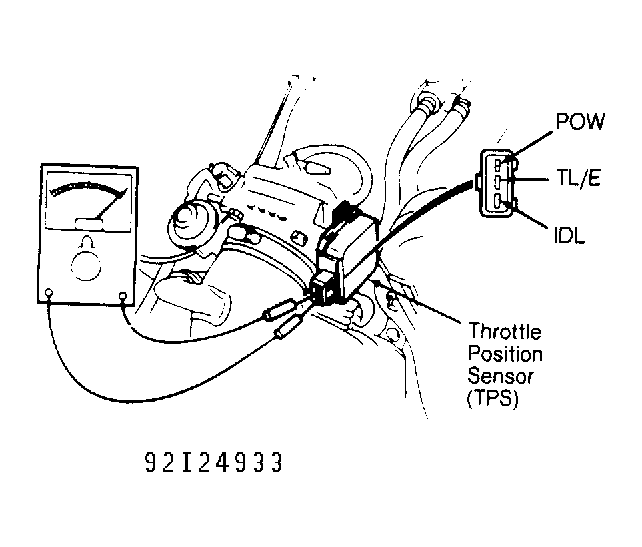 1. Disconnect TP sensor connector. Connect ohmmeter between terminals IDL and TL/E of TP sensor connector. See Fig 1 . Insert a .016" (.41 mm) feeler gauge between throttle lever and throttle stop screw.