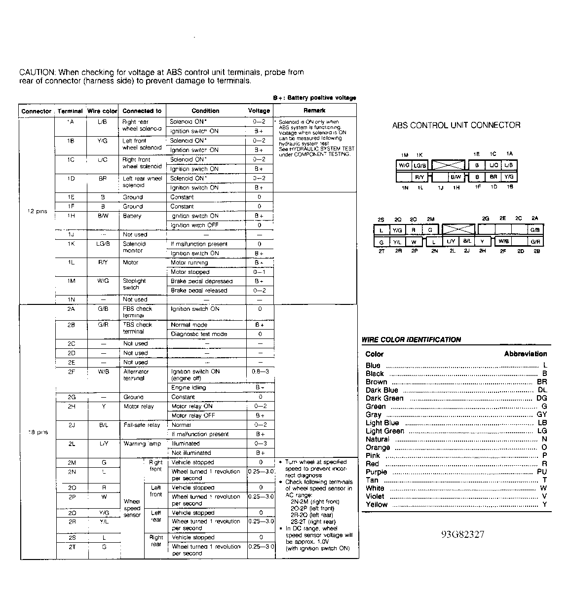When checking for voltage at ABS control unit terminals, probe from rear of connector (harness side) to prevent damage to terminals. See Fig 1 .