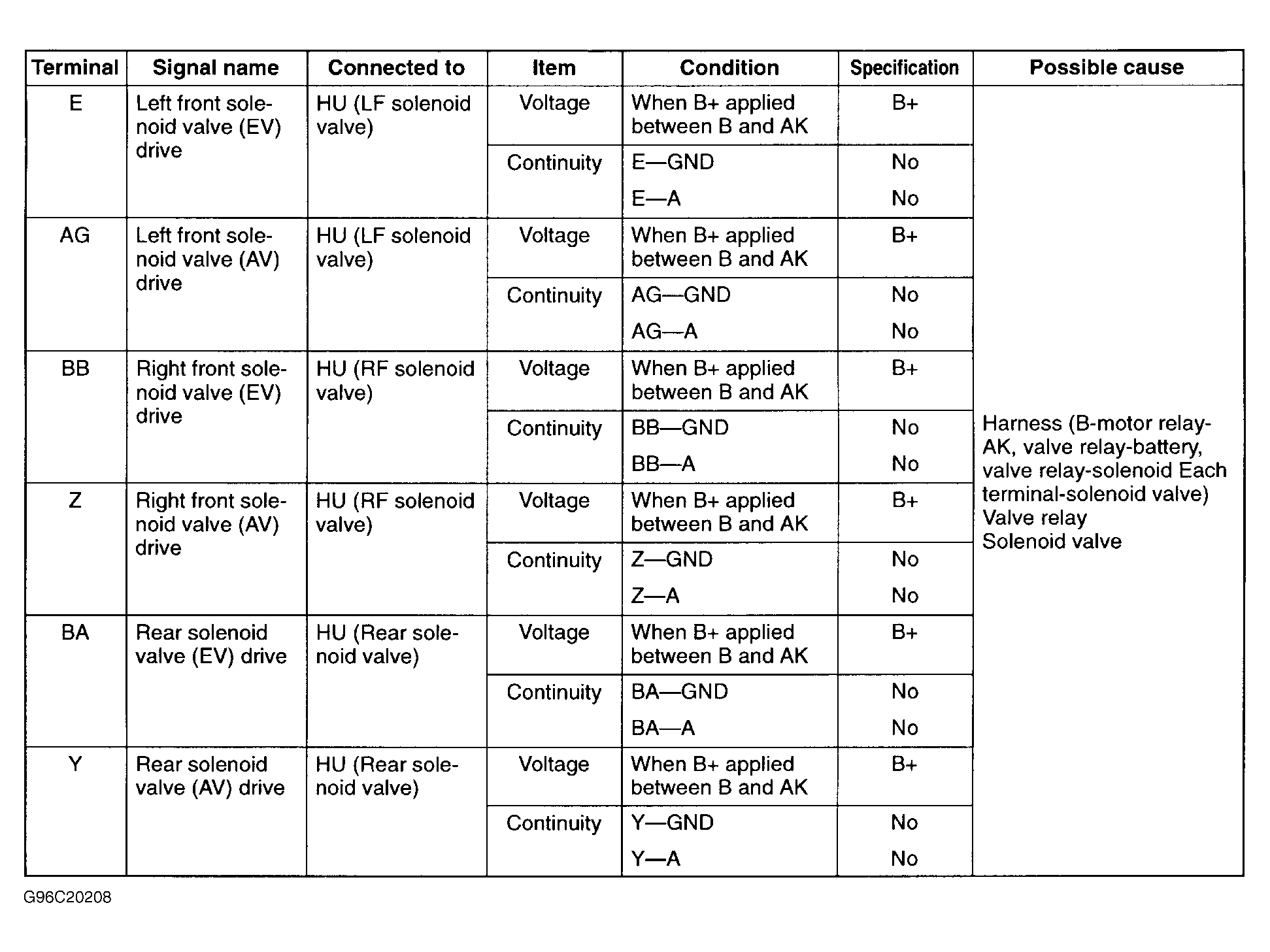 Turn ignition off. Test ABS Control Module (ABS CM) using DVOM and Adapter Harness (49-F066-002) connected to ABS CM connector. See Fig 1 . Measure resistance, continuity or voltage as specified. See Fig 1 through Fig 4 If checking voltage, measure between applicable terminal and GND terminal (AB, AC or AM) of ABS CM connector. If voltage, continuity or resistance is not as specified, replace ABS CM.
