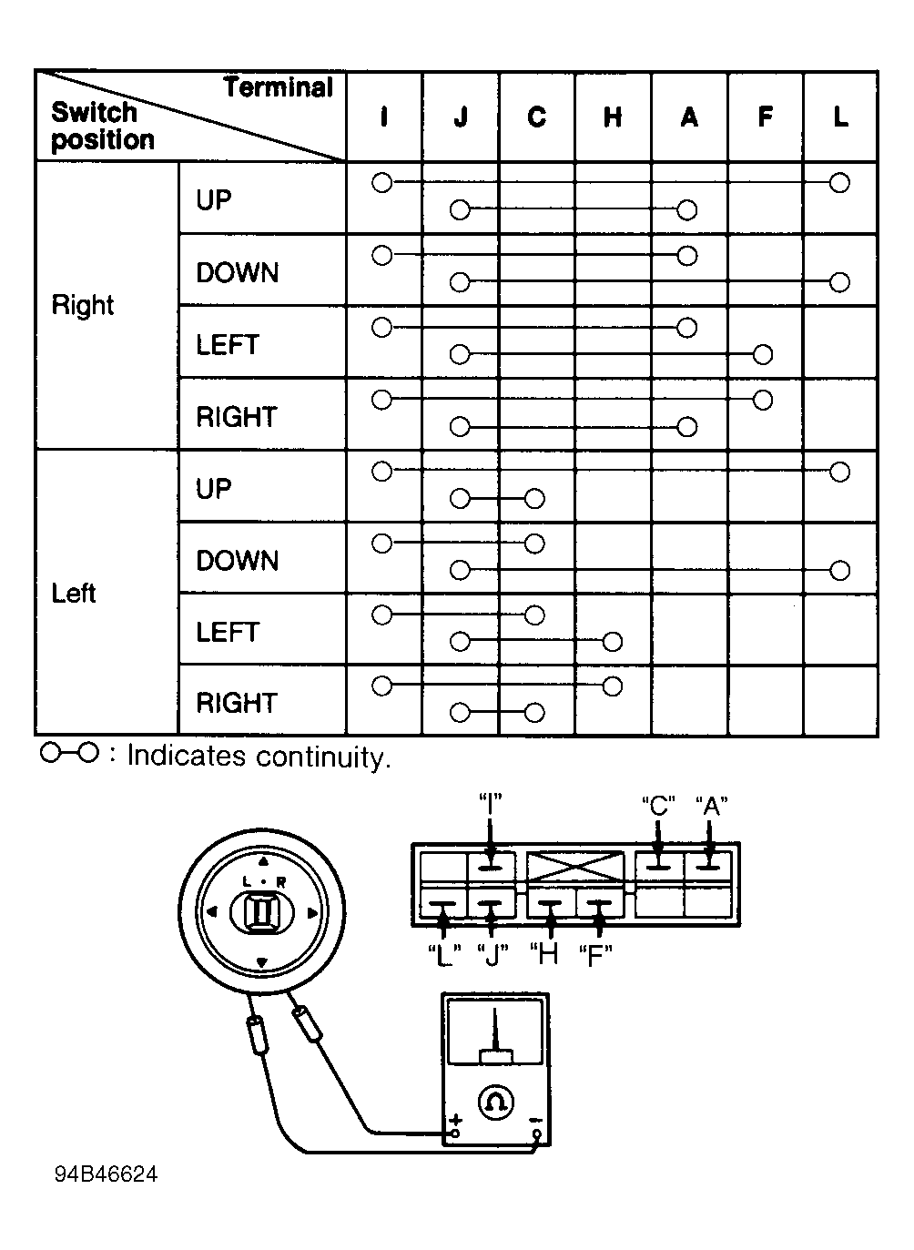 Disconnect power mirror switch connector (remove power mirror switch if necessary). See POWER MIRROR SWITCH under REMOVAL & INSTALLATION. With power mirror switch in specified position, check continuity between specified terminals of the switch connector. SeeFig 1 . If continuity is not as specified, replace power mirror switch.