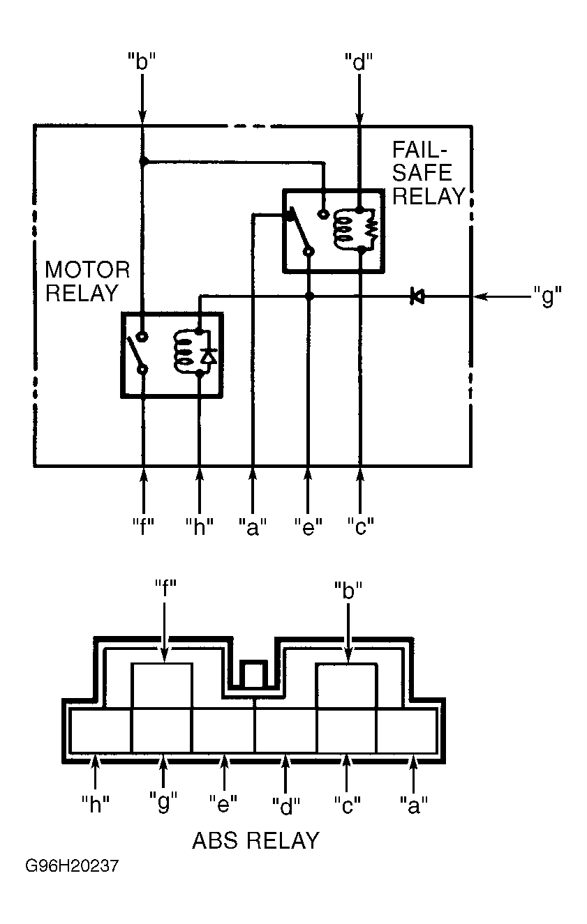- Apply 12 volts to terminal "G" and ground terminal "H" of ABS relay. See Figure . Using ohmmeter, check continuity between terminals "B" and "F" of ABS relay. Continuity should exist. If continuity is not as specified, replace ABS relay.