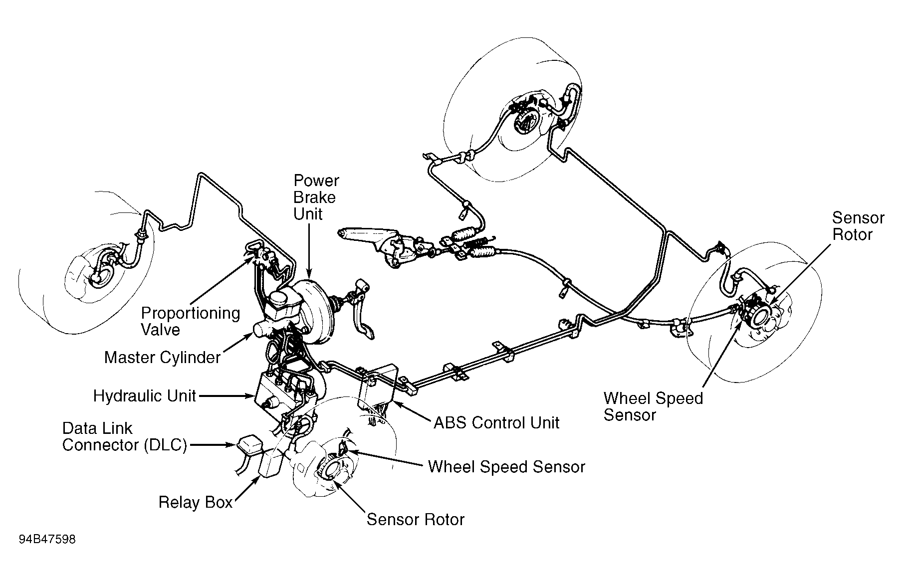 The Anti-Lock Brake System (ABS) control module senses reductions in front and rear wheel speed and modulates hydraulic pressure to the brakes to prevent wheel lock-up. The ABS consists of a hydraulic unit, 4 wheel speed sensors and sensor rotors, ABS relay (fail-safe relay and motor relay), pump motor and ABS control module. See Fig 1 . An ABS warning light is located on the instrument cluster.