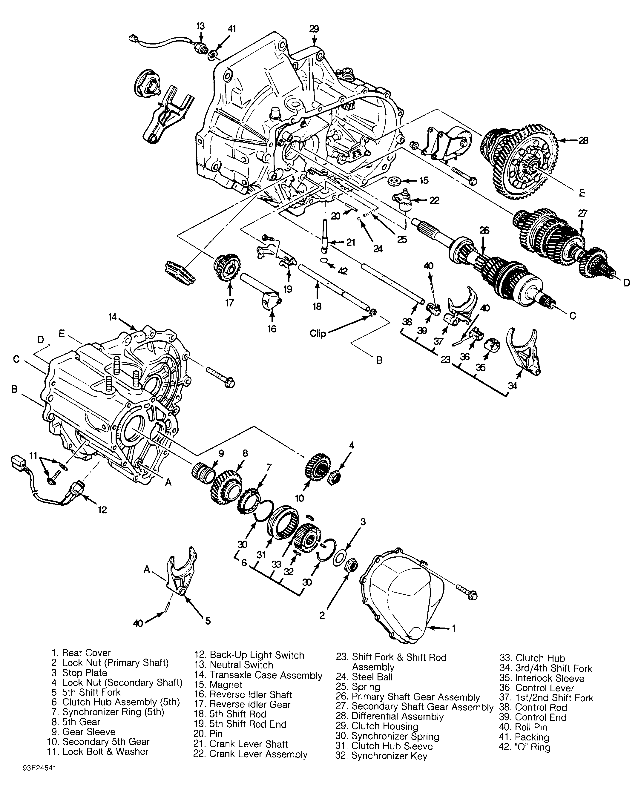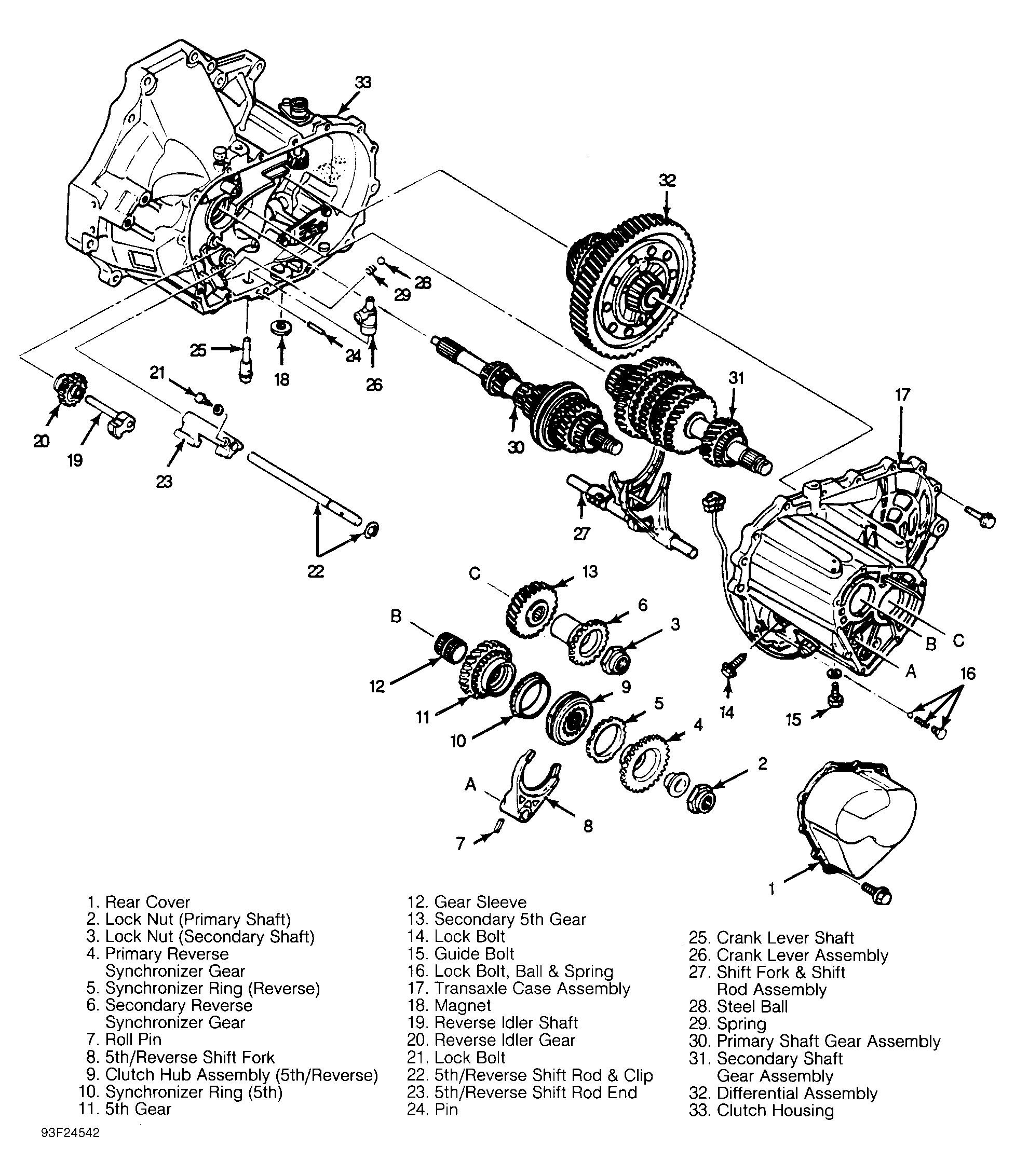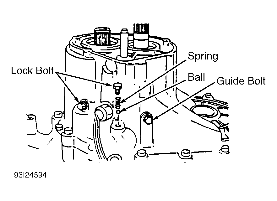 - Remove secondary 5th gear. Remove guide bolt from outside of case. See Figure. Remove back-up light switch, neutral switch and lock bolt. Remove bolts securing transaxle case to converter housing. Using soft-faced hammer, strike case to loosen and remove.