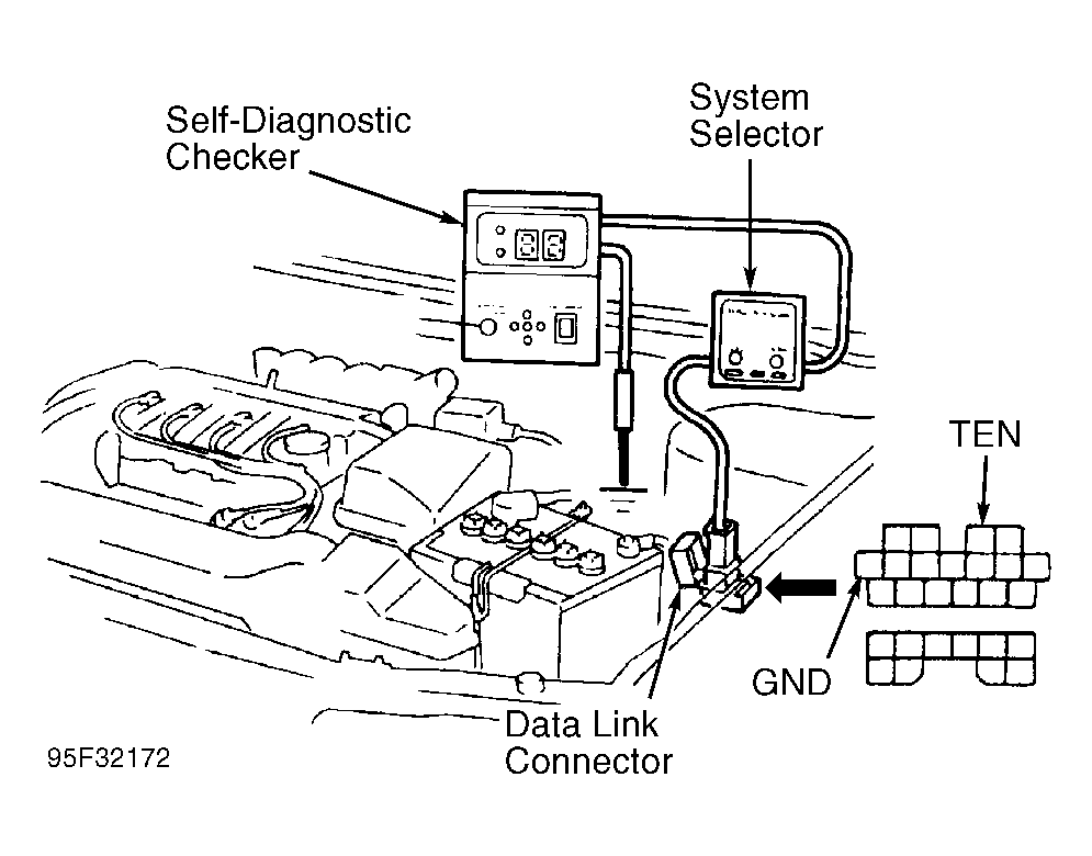 1. If system selector is not available, connect a jumper wire between terminals TEN and GND of data link connector. See Fig 1 . Observe Malfunction Indicator Light (MIL). Note trouble codes. Check TROUBLE CODE IDENTIFICATION  chart for possible cause.