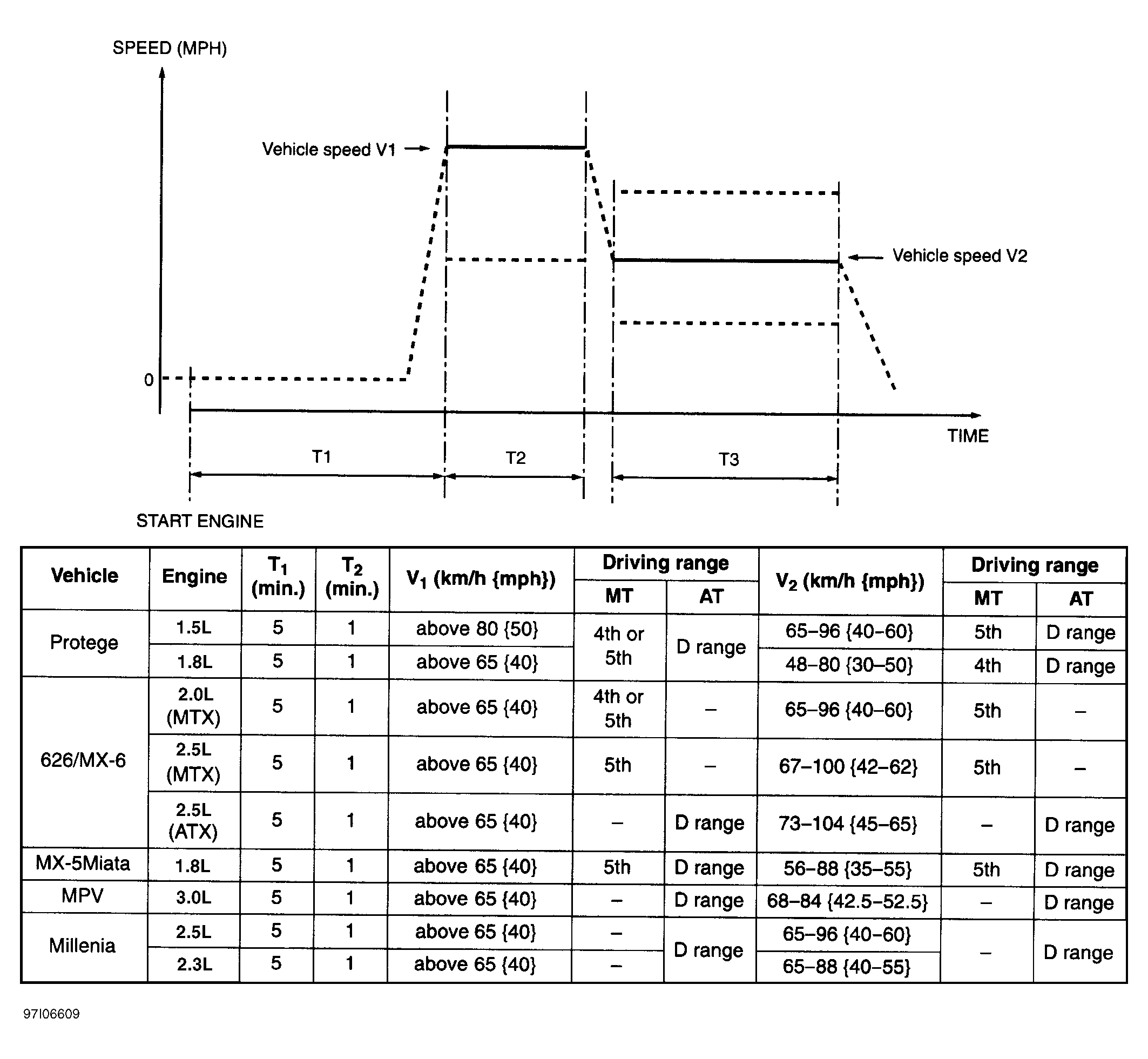 Start engine and warm to normal operating temperature. Ensure all electrical and A/C loads are off. Idle engine for additional 5 minutes. Drive vehicle at specified speed (V1) for one minute. Lower vehicle speed to specified speed (V2) for 3 minutes. See Fig 1.