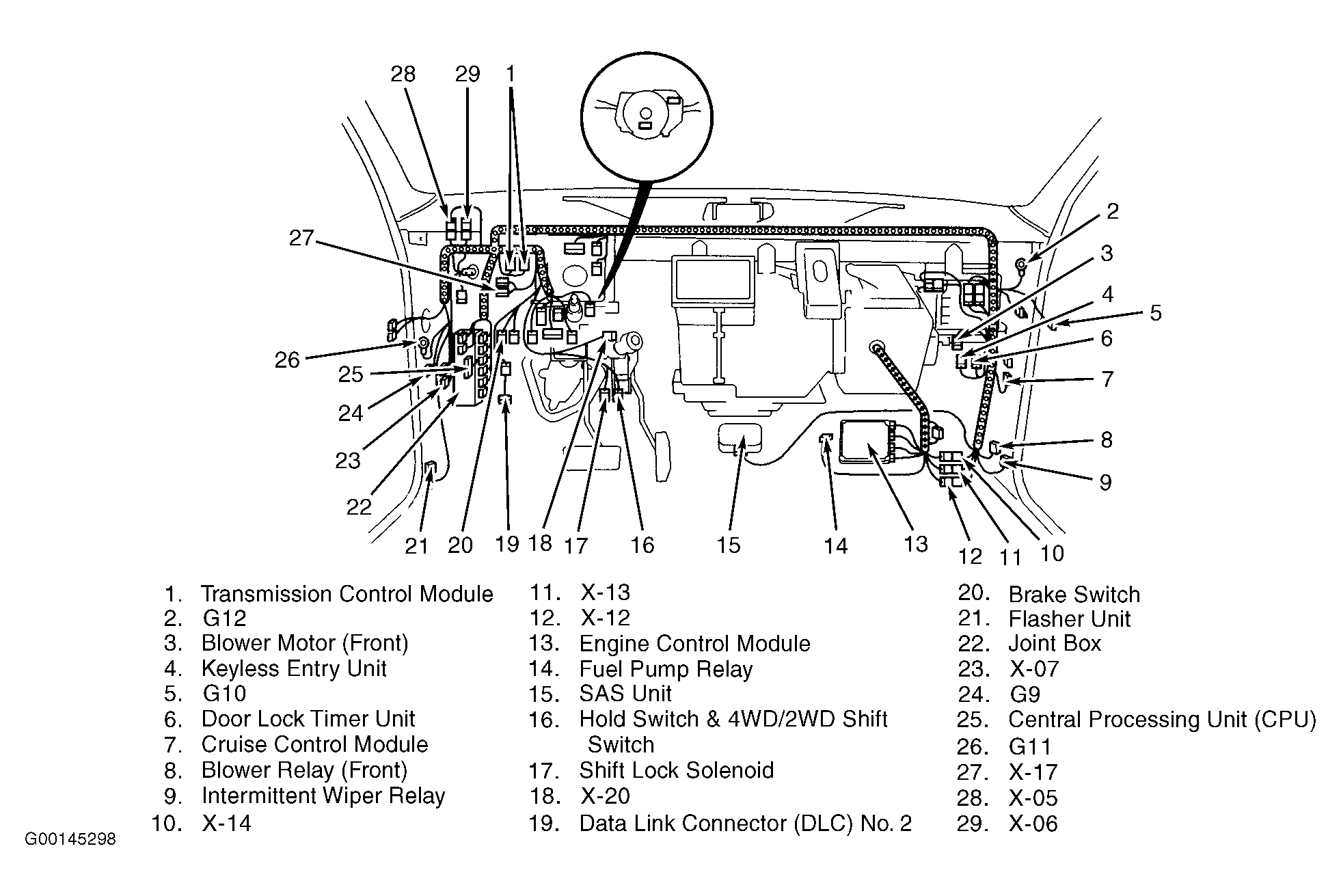 | SAS Unit | Under right side of dash. See Figure . |