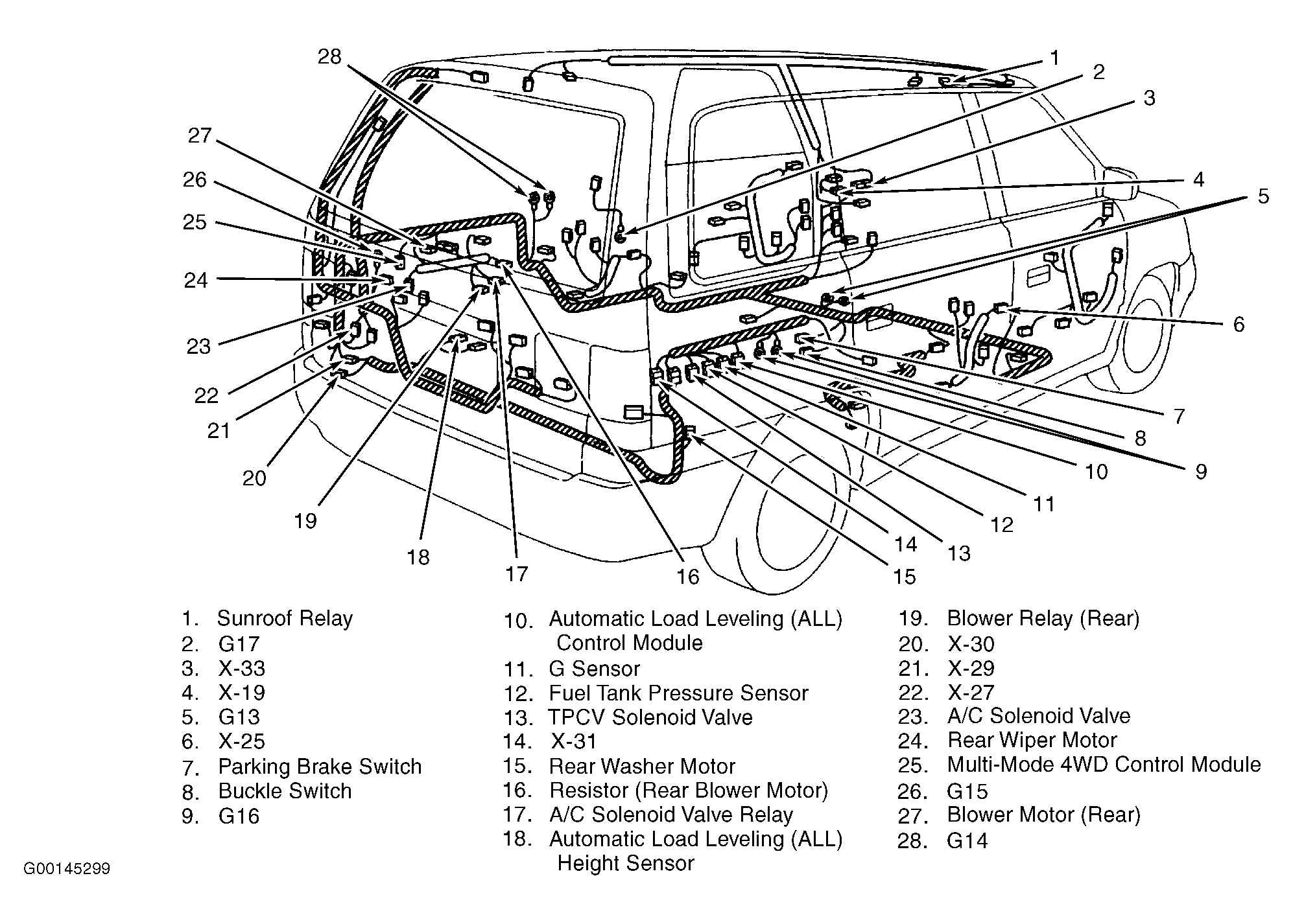 | Automatic Load Leveling (ALL) Control Module | At right rear of vehicle, behind trim panel, near wheel well. See Figure . |