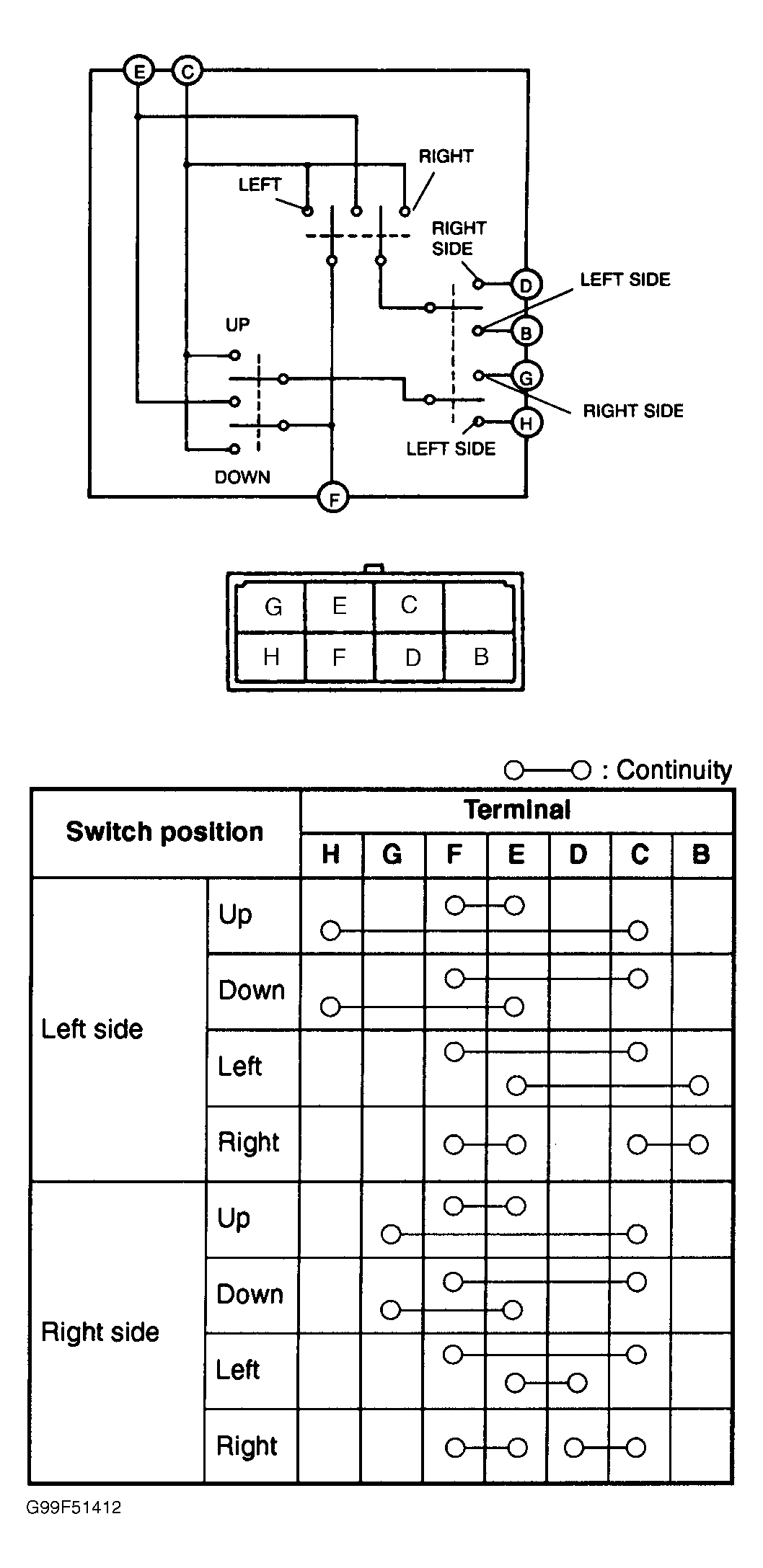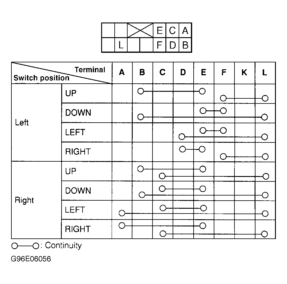 Disconnect power mirror switch harness connector (remove power mirror switch if necessary). See POWER MIRROR SWITCH under REMOVAL & INSTALLATION. With power mirror switch in specified position, check continuity between specified terminals of switch connector. See Fig 1 through Fig 4 . If continuity is not as specified, replace power mirror switch.