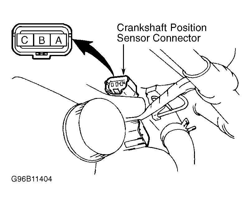 Disconnect crankshaft position sensor connector. Using ohmmeter, measure resistance between terminals "A" and "B". See Fig 1 . Resistance should be as specified. See CRANKSHAFT POSITION SENSOR RESISTANCE  table. If resistance is not as specified, replace crankshaft position sensor.