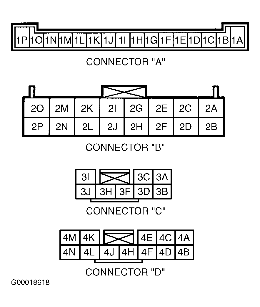 1. Locate CPU behind left kick panel. For connector "A", disconnect CPU from joint box and take measurements at CPU terminals. For connectors "B", "C" and "D", using DVOM, leave CPU connectors attached to measure voltage at specified terminals (backprobe connectors). To check continuity, disconnect CPU connectors and measure at specified connector terminal. See Fig 1 -Fig 5 .