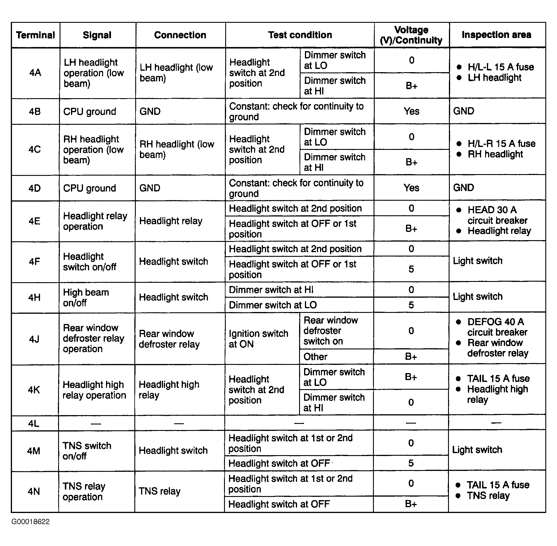 2. If voltage measurements or continuity are not as specified, check related components and wiring harnesses. If related components and wiring harnesses are okay, but system is still not functioning properly, replace CPU. See CENTRAL PROCESSING UNIT (CPU)  under REMOVAL & INSTALLATION.