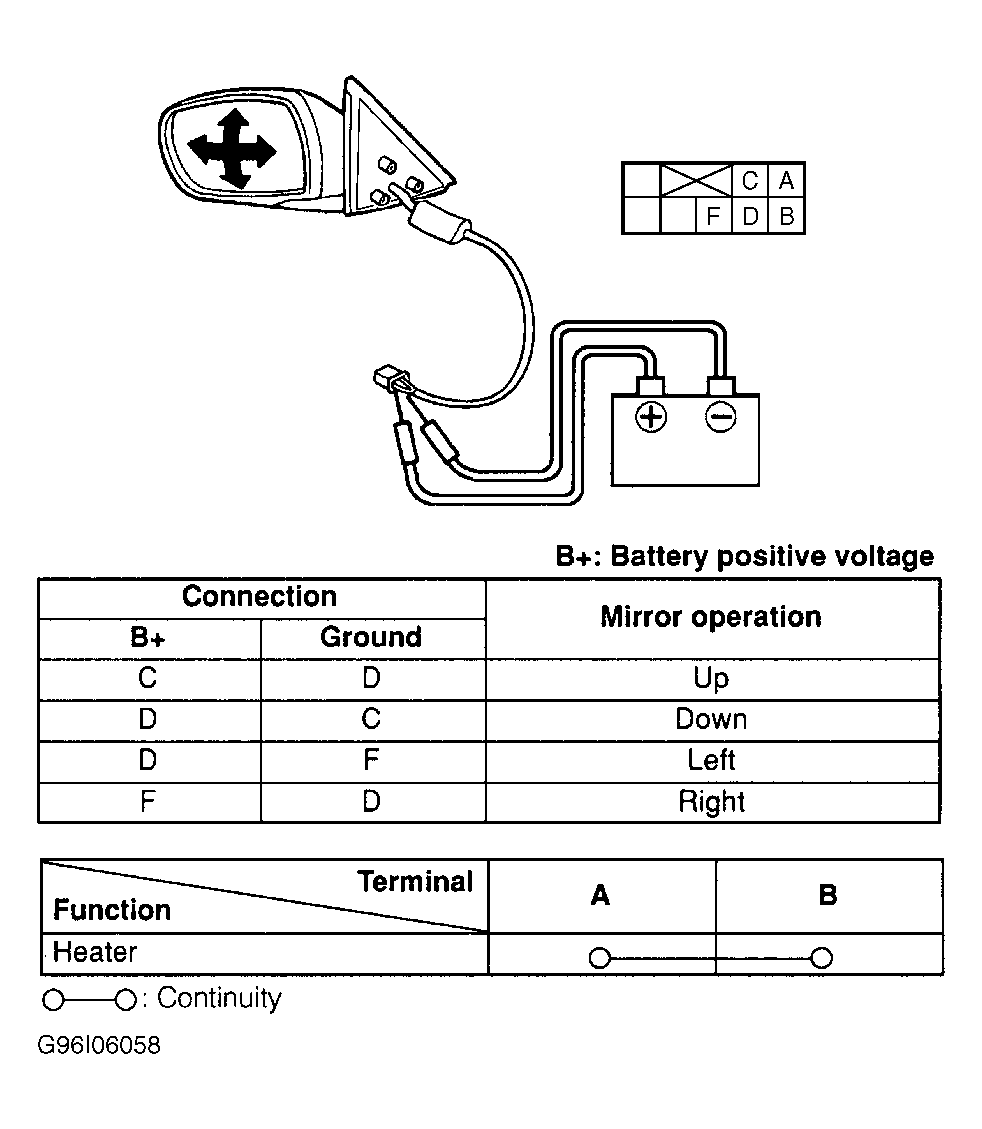 Disconnect power mirror motor harness connector (remove door trim panel if necessary). See POWER MIRROR ASSEMBLY  under REMOVAL & INSTALLATION. Apply battery voltage and ground to specified terminals of power mirror motor connector. See Fig 1 through Fig 5 . If mirror does not move as specified, replace power mirror assembly.
