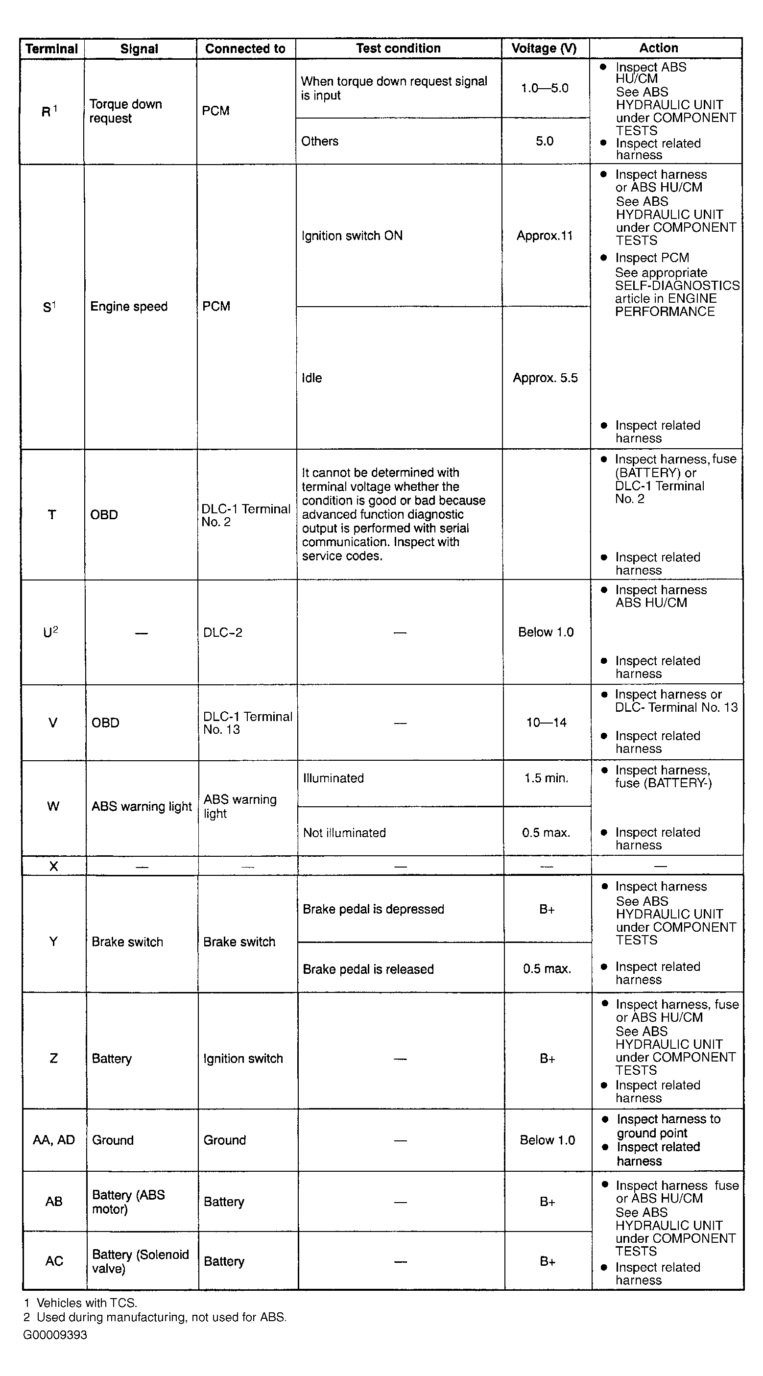 ABS CM is located on left side of engine compartment. Unless indicated otherwise, test with engine operating at idle and ABS CM connector connected. Measure voltage between ground and appropriate ABS CM connector terminal. See Figure -Figure . If voltage is not as specified, check suspect component listed under ACTION. If components are okay, replace ABS CM.