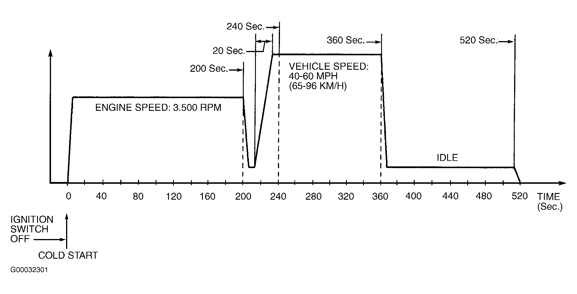 2. Start and operate engine at 3500 RPM to warm to normal operating temperature. Operate vehicle as specified. See Fig 1 . Stop vehicle and access ON BOARD SYSTEM READINESS menu of GENERIC OBD II FUNCTIONS to check drive mode completion status. RFC should change from NO to YES when test is complete. If test is not complete, turn ignition off and repeat this step. If test is complete, go to next step.
