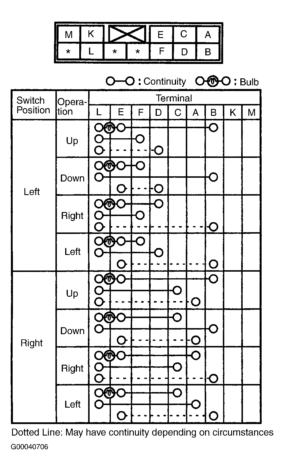 Disconnect power mirror switch harness connector (remove power mirror switch if necessary). See POWER MIRROR SWITCH under REMOVAL & INSTALLATION. With power mirror switch in specified position, check continuity between specified terminals of switch connector. See Fig 1 through Fig 4 . If continuity is not as specified, replace power mirror switch.