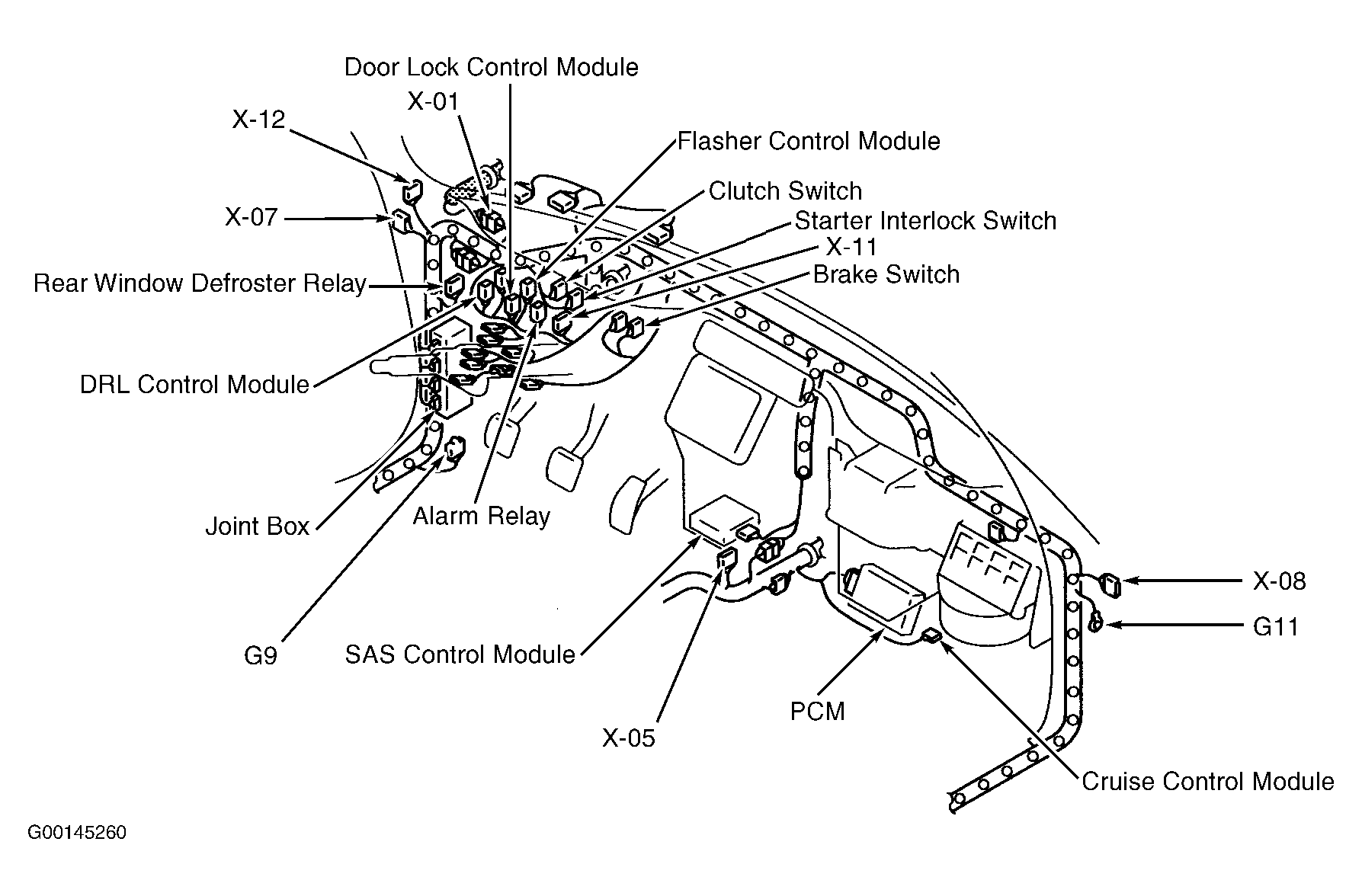 | Cruise Control Module | Behind right side of dash. See Figure . |