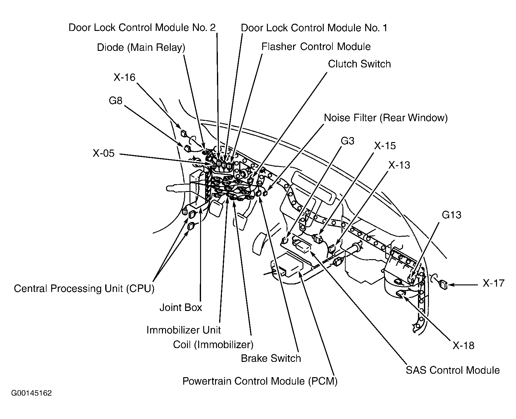 | Door Lock Control Module No. 1 | Behind left side of dash, near joint box. See Figure . |