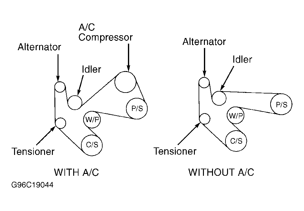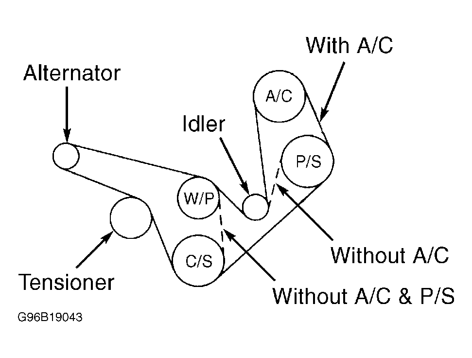 Drive belt tension is regulated by automatic tensioner. Use illustration for proper routing. See