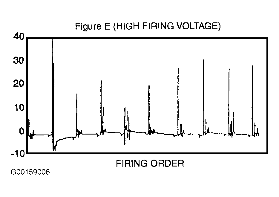 Check spark plug firing voltage average and evenness. See Fig 5 . If average value of spark plug firing voltage is more than 20KV with evenness of spark plug voltage within 8KV or less, conditions affect all cylinders. Proceed as follows:- Inspect spark plug wires and spark plugs.