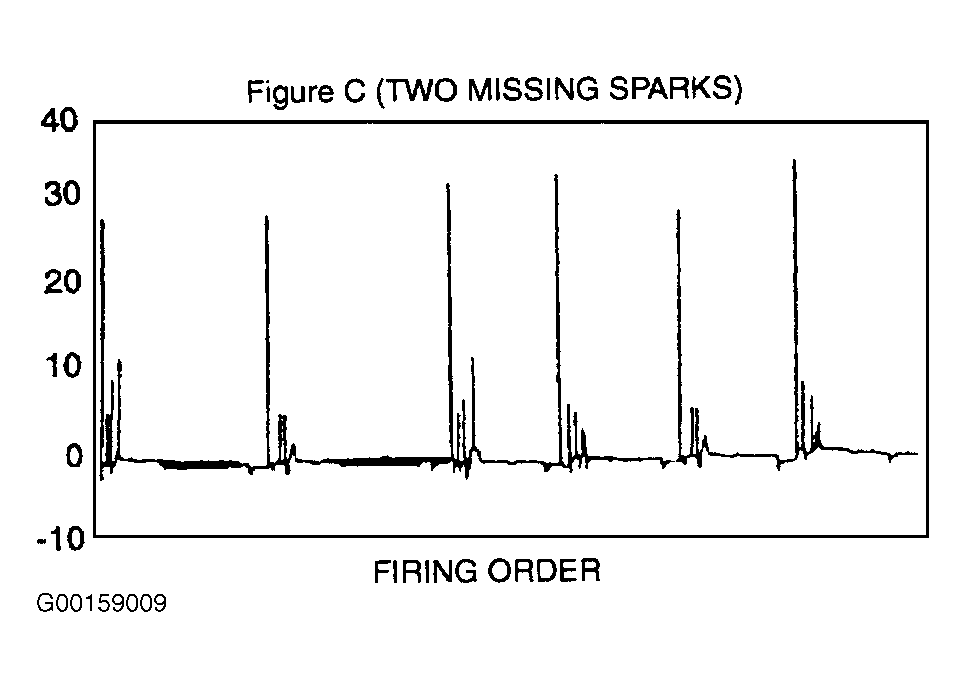 Observe scope pattern. See to Fig 3 . If spark pattern is missing from two cylinders on same coil, proceed as follows:- Inspect spark plug wires and spark plugs for missing cylinders.