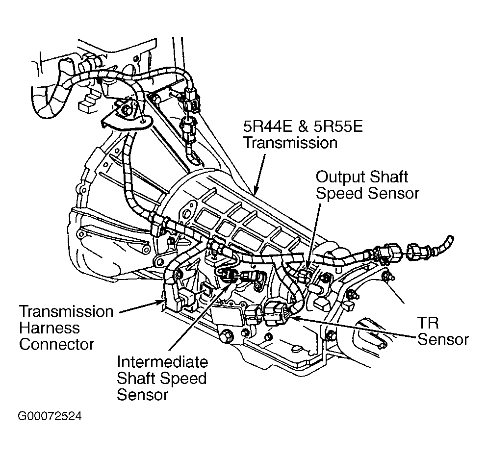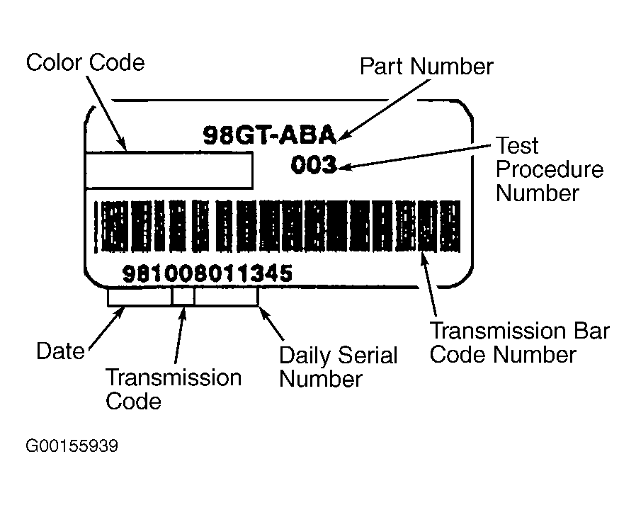 The 5R44E and 5R55E 5-speed automatic transmissions can be identified by the vehicle certification label, located on driver's door post. This label contains the transmission letter code under space marked TR (next to space marked AXLE). Letter code for 5R44E and 5R55E transmission is "D". Transmission can also be identified by service identification tag attached to transmission case. See Fig 1 -Fig 3 .