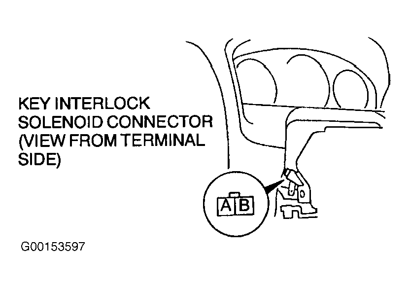 Disconnect negative battery cable. Remove steering column cover. Disconnect key interlock solenoid connector. Inspect continuity between component connector terminals. See Fig 1 . If continuity does not exist, replace key interlock solenoid. Install column cover. Connect negative battery cable.