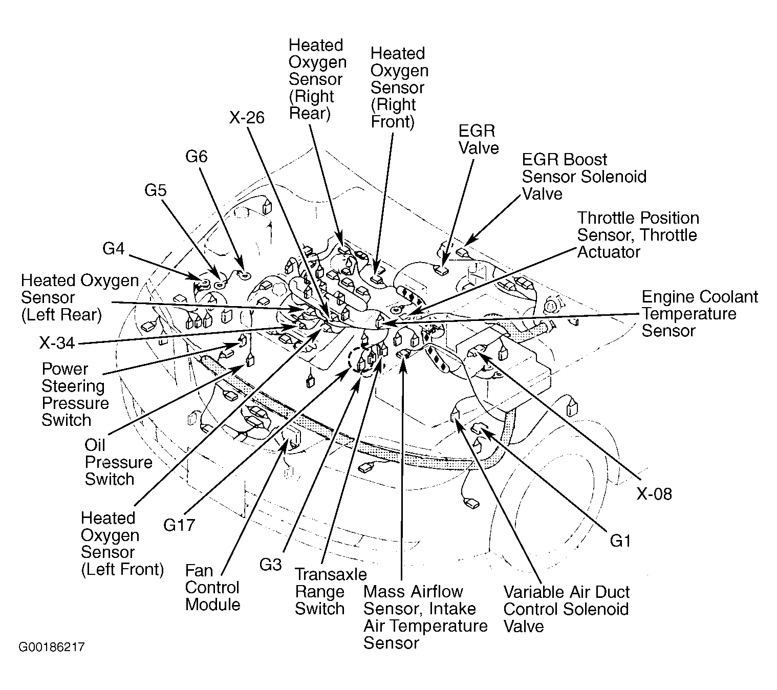 | Fan Control Module | At left front of engine compartment. See Figure. |