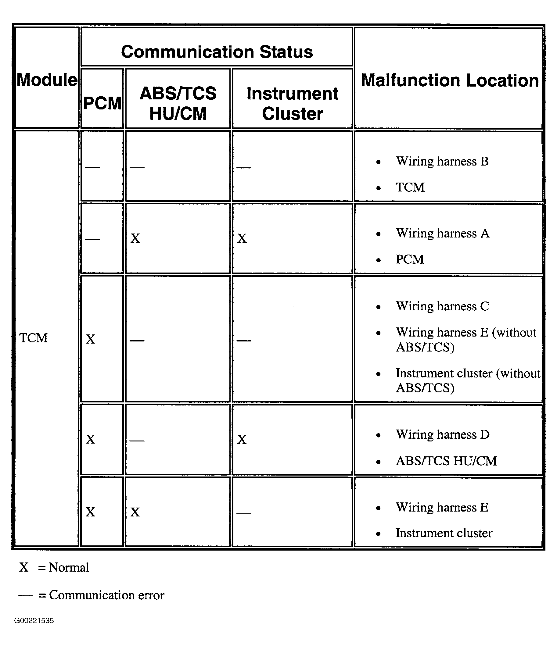 - Referring to TCM Malfunction Locator Table, determine malfunctioning part of CAN system. See Figure and Fig 1 .