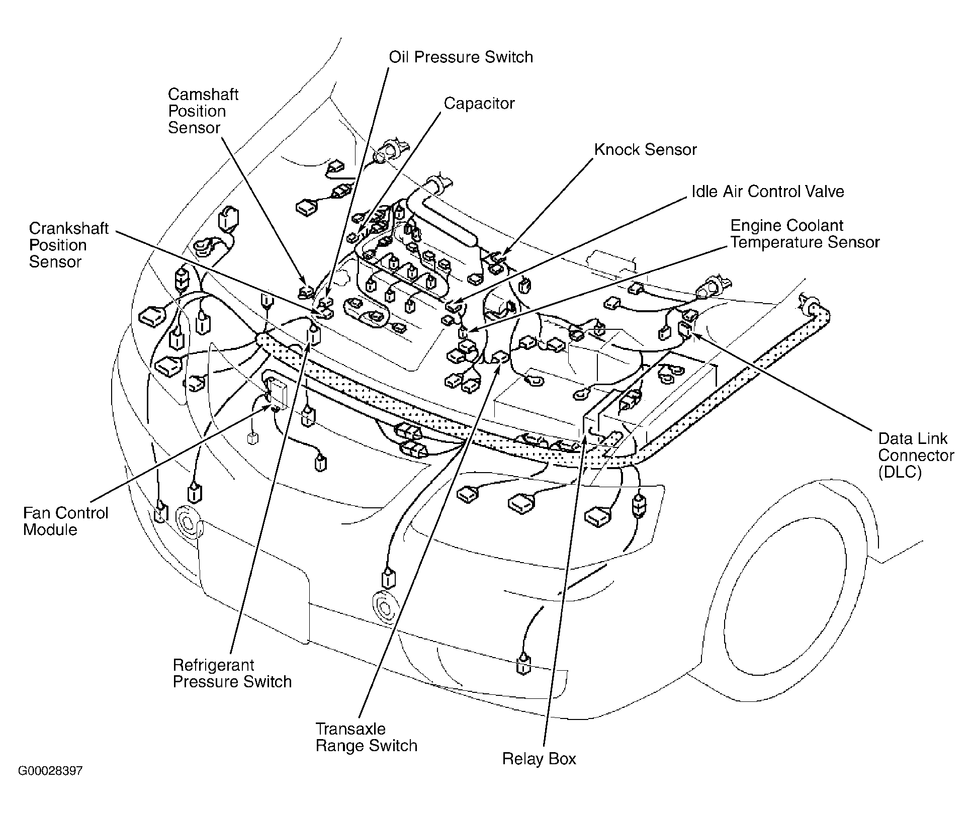 | Fan Control Module | At right front of engine compartment. See Figure. |