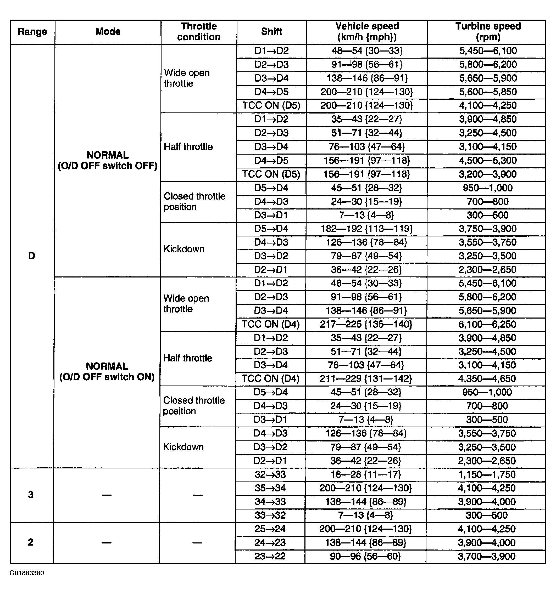 - 1GR --> 2GR, 2GR --> 3GR, 3GR --> 4GR, and 4GR --> 5GR upshifts and downshifts are obtained in D range (O/D OFF switch OFF).
